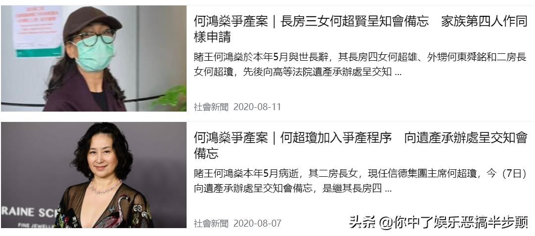 不过虽然这样说,但是在何鸿燊死前一个星期,何家还是传出过争产丑闻,正是媒体爆料分得遗产最少的大房一脉。据当时的港媒爆料,在何鸿燊过世前一周,同为大房女儿的何超雄和同母胞妹何超贤撕破脸,因何超雄要求何超贤交出多项父母信托文件,并向法院申请登记知会备忘录。何鸿燊原配正妻黎婉华离世后,她大部分财产都交由女儿何超贤打理,其中包括价值三十亿港币的香港浅水湾道1号的豪宅。