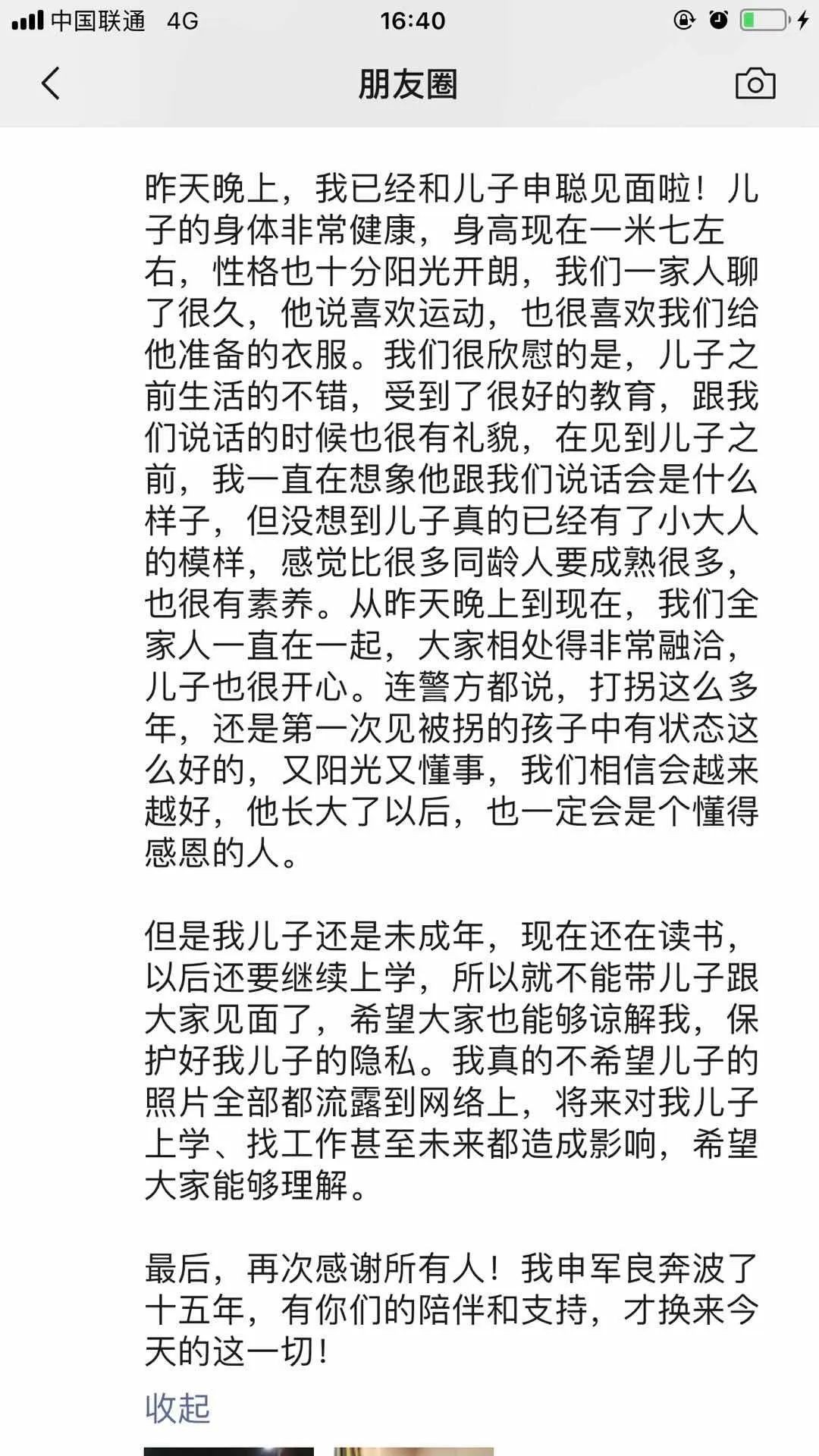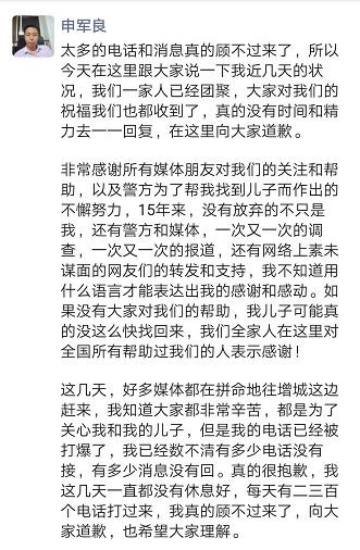 今天下午,寻子父亲申军良发布长文讲述与儿子团聚的情况。