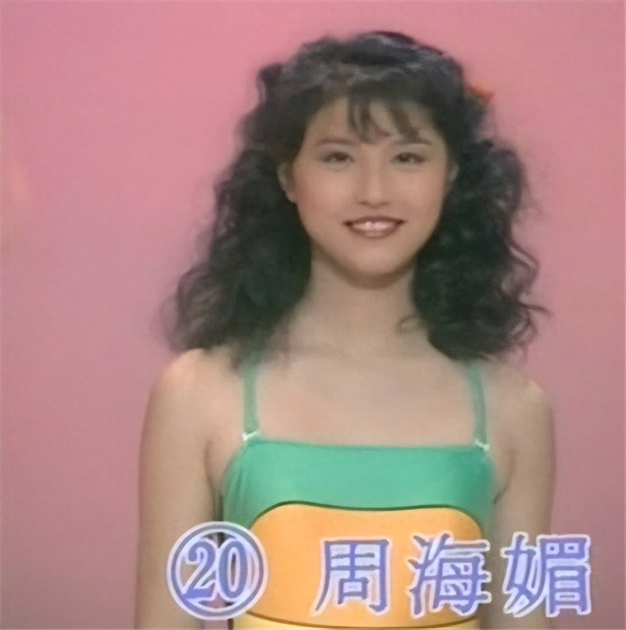 竞选香港小姐时候的周海媚,留着当时最流行的大波浪,脸上尚有一些稚气未脱