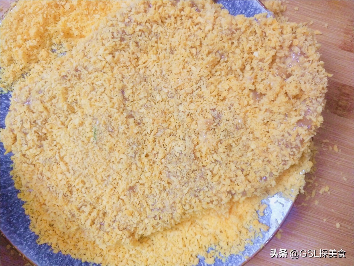 接着把鸡胸肉上面裹上面包糠,放进锅中煎制就可以了,煎制两面金黄,家常版的鸡排就是做好了。