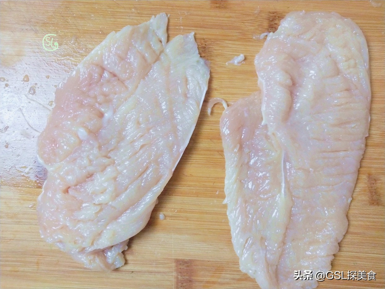第1步,我们先准备几块鸡胸肉,把鸡胸肉的筋膜去掉,然后对半切开,把每一个鸡胸肉都用刀背捶一捶,把鸡胸肉捶散,这样制作出来的鸡排更入味。