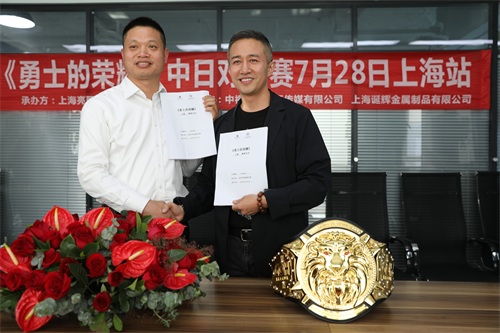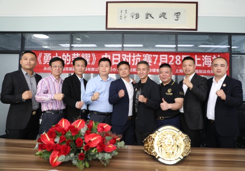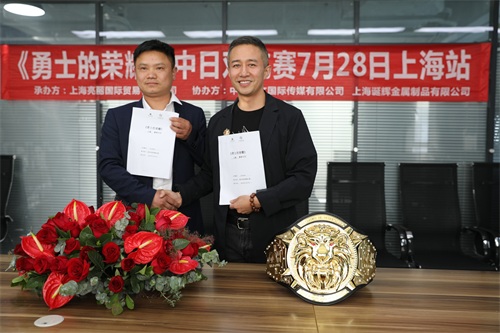 上海亮丽国际贸易有限公司总经理朱结亮、中视视文国际传媒有限公司董事长陈国明、上海诞辉金属制品有限公司总经理王志卫、勇士的荣耀首席赛事推广人张甫、勇士的荣耀首席赛事推广人方彦与勇士的荣耀创始人、万名扬传媒CEO郭晨冬进行了赛事签约。