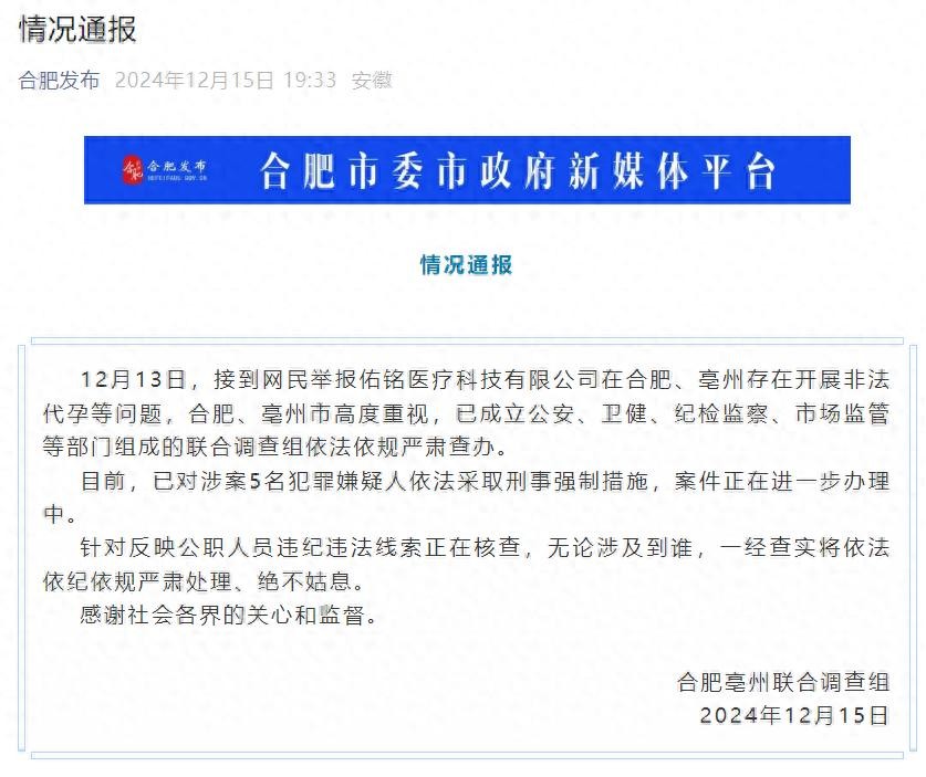 合肥通报代孕事件核查情况:涉公职人员,5人被采取刑事强制措施