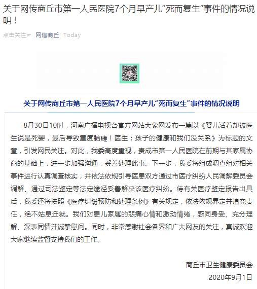 9月1日,河南商丘市卫健委发布关于网传商丘市第一人民医院7个月早产儿“死而复生”事件的情况说明。