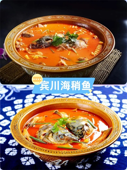 宾川气候干热,民风火爆,源于海稍水库的宾川海稍鱼也符合这个特征。鲢鱼,活鱼现杀现煮,加入蒜姜大葱辣椒、香菜、芝麻、盐味精、鸡精花椒配料,鱼质鲜美。上得桌来,蘸水火红油亮,伴着一阵阵的"滋啦啦"的响声,蘸水沸腾起来,食之辣香伴着蒜香,一秒钟里令你没有防备的味觉与嗅觉瞬间兴奋起来!
