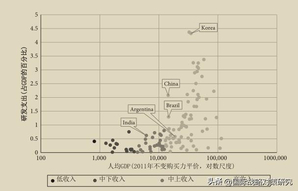 图9.1A显示了不同收入水平的国家的研发与GDP的比率。尽管该图似乎表明收入水平与研发与GDP的比率之间存在正相关,但在中等收入国家,或人均收入在1000美元至10000美元之间的国家,该比率基本持平。换句话说,在这组国家中,该比率并没有随着人均收入的增加而按比例增加,这表明平坦的关系是中等收入陷阱的根本原因,正如Lee(2013 )在同一图表中所指出的。通过研究各国申请的美国专利数量,可以得出类似的结论。20世纪80年代初,当韩国的收入水平与巴西和阿根廷相似时,韩国人的美国专利申请数量约为50件,在巴西和阿根廷等其他中等收入国家的范围内(Lee和Kim 2009;表1)。在20世纪80年代和90年代,韩国人的生请迅速增加,是其他中等收入国家平均水平的10倍以上,这些国家研发支出(占GDP的百分比)的收入保持相对稳定。