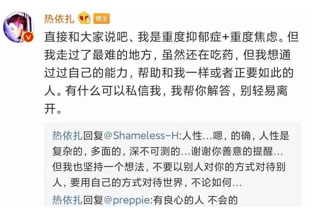 对于很多名人忌讳谈及的抑郁症,热依扎也没有刻意回避,甚至主动分享自己的抗病经历,还会积极帮助向她寻求帮助的人。