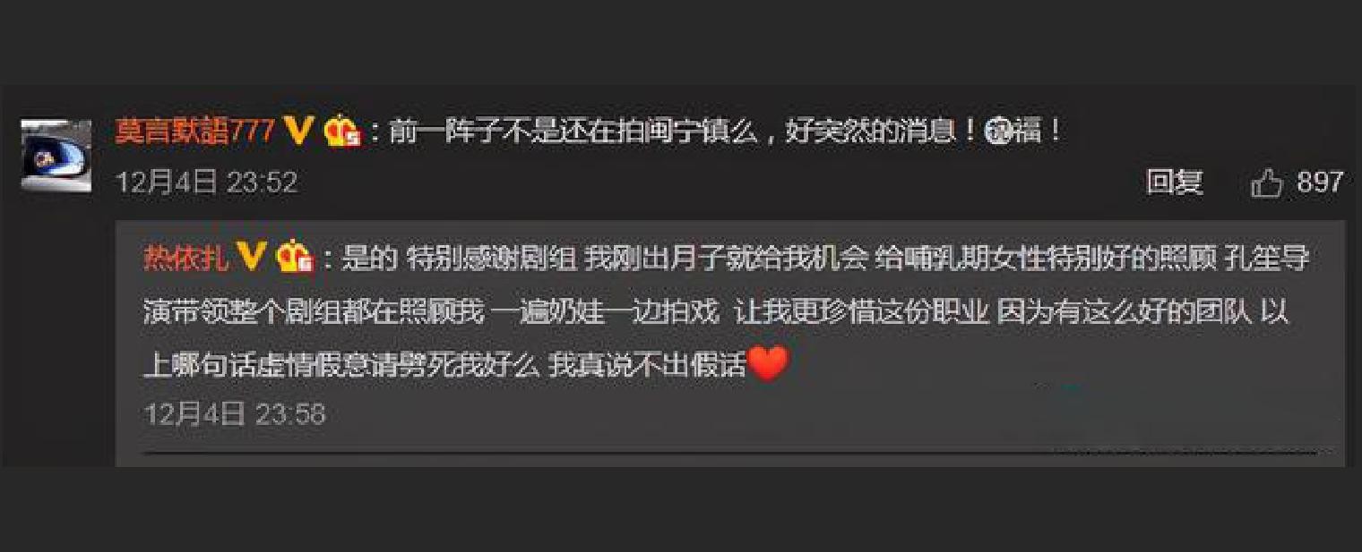 当时,也有人问热依扎,正在拍《山海情》的她如何生了孩子?热依扎回复:“是的,特别感谢剧组,我刚出月子就给我机会,整个剧组都在照顾我。”