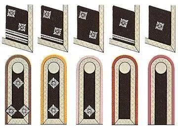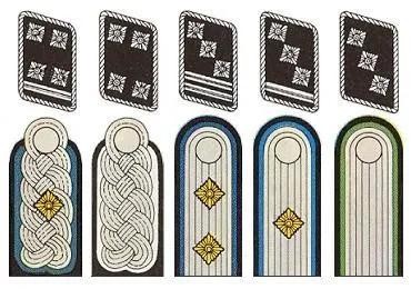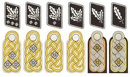 这个军衔就有点争议了,有人说叫准将,有人说应该叫大校。但我觉得,首先,这个军衔的肩章是银色底板加两颗军衔星,与上校的肩章一模一样,而将官的肩章则全部是金色底板。因此似乎称为准将有些勉强,而大校军衔是苏联发明的,似乎与德国关系不大,而且肩章与上校完全一致,唯一的区别就是领章。最关键的一点,区队长和上校旗队长实际权力基本并无不同。因此,我比较倾向于另外有人提出的第三种说法,资深上校。