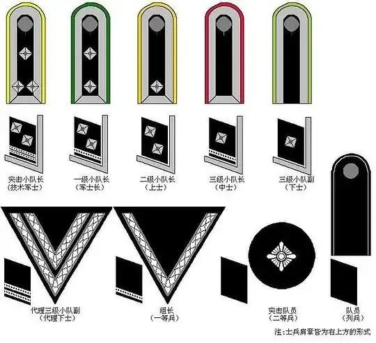 可以看到,同为士官,领章上的军衔星却有不同,前三个是两颗军衔星,后两个是一颗军衔星,所以这也是造成诸多争议的地方。为了方便继续,我这里就将其称为军士长,军士,上士,中士,下士五个级别。