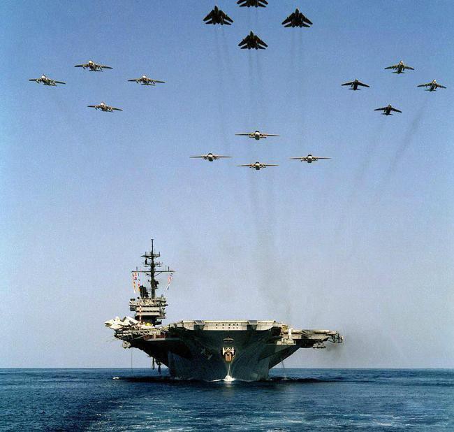 “小鹰号”航空母舰是在福莱斯特级航空母舰的基础上发展而来,舰上配备了9个舰载机中队,包含20架F-14战斗机、16架A-6攻击机、4架E-2C预警机等多达80多架各型飞机。