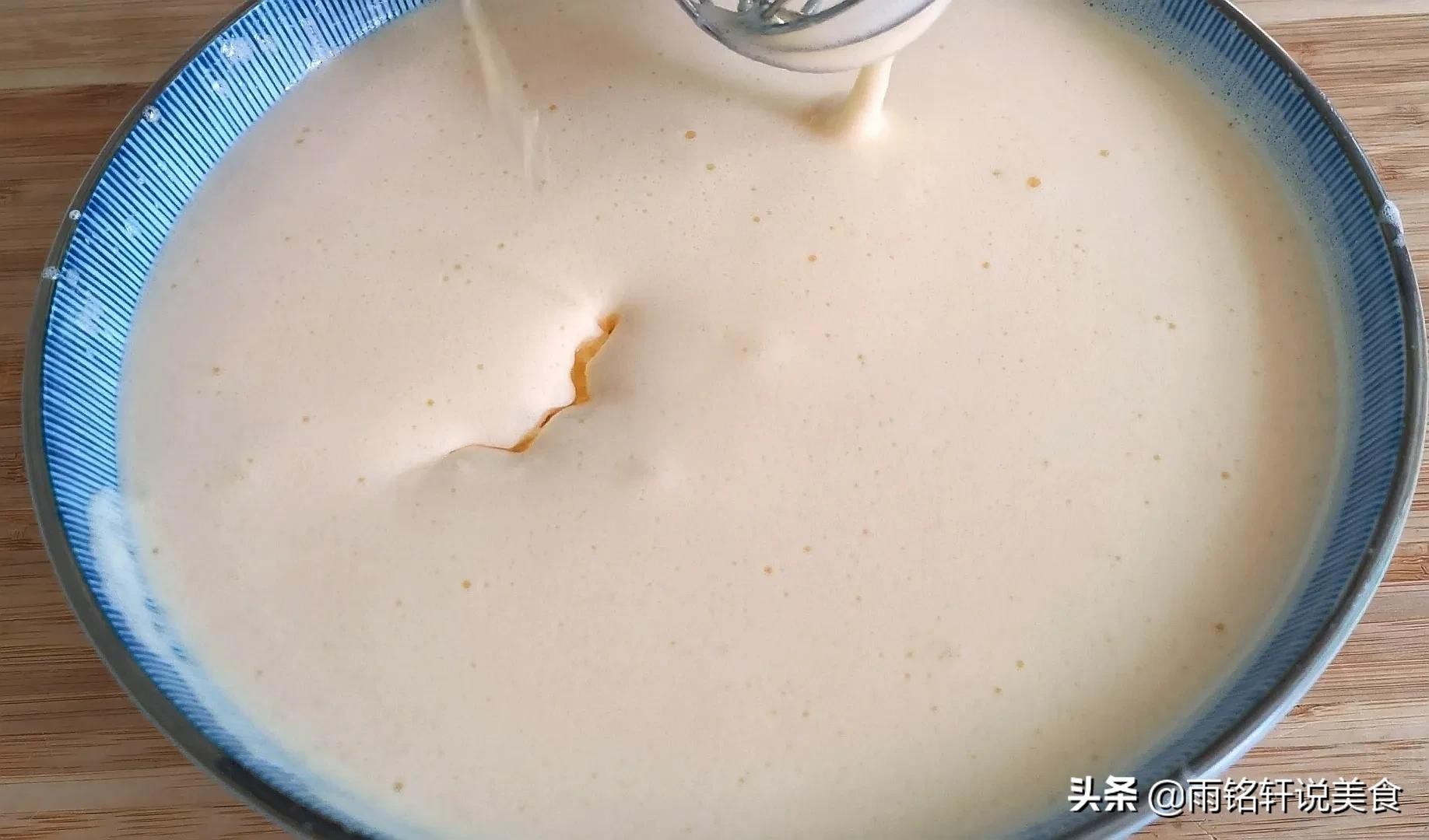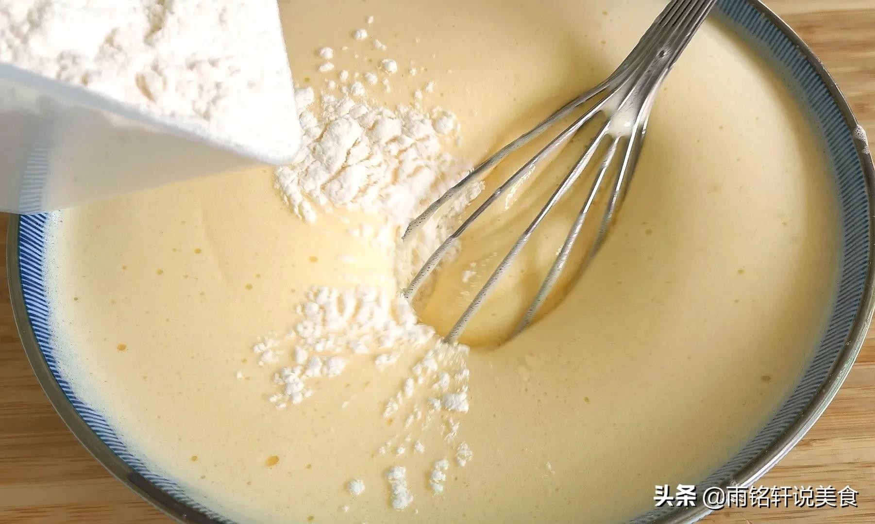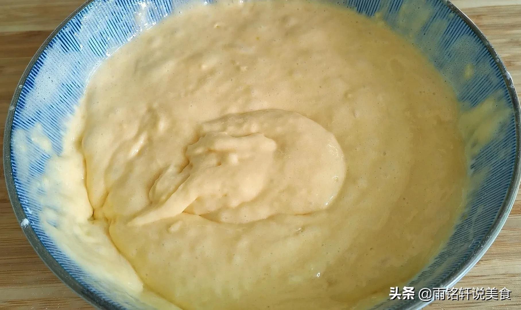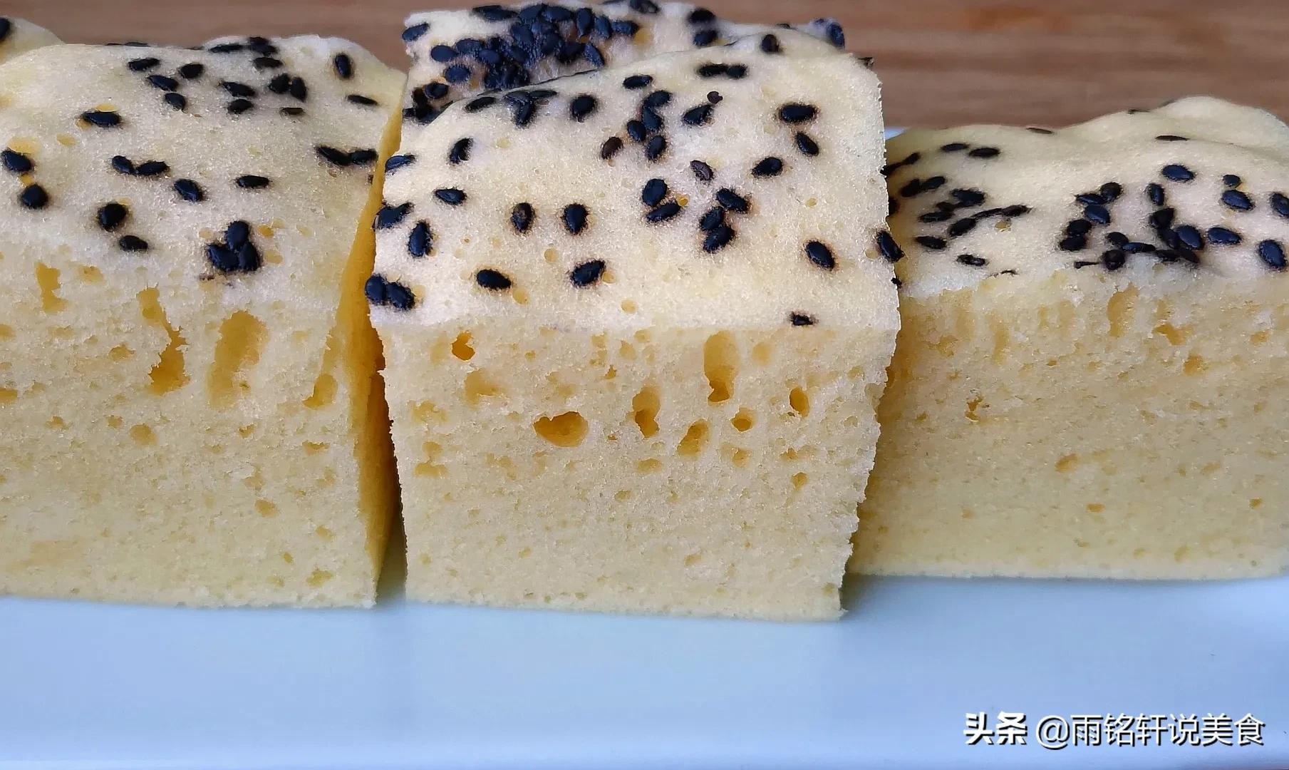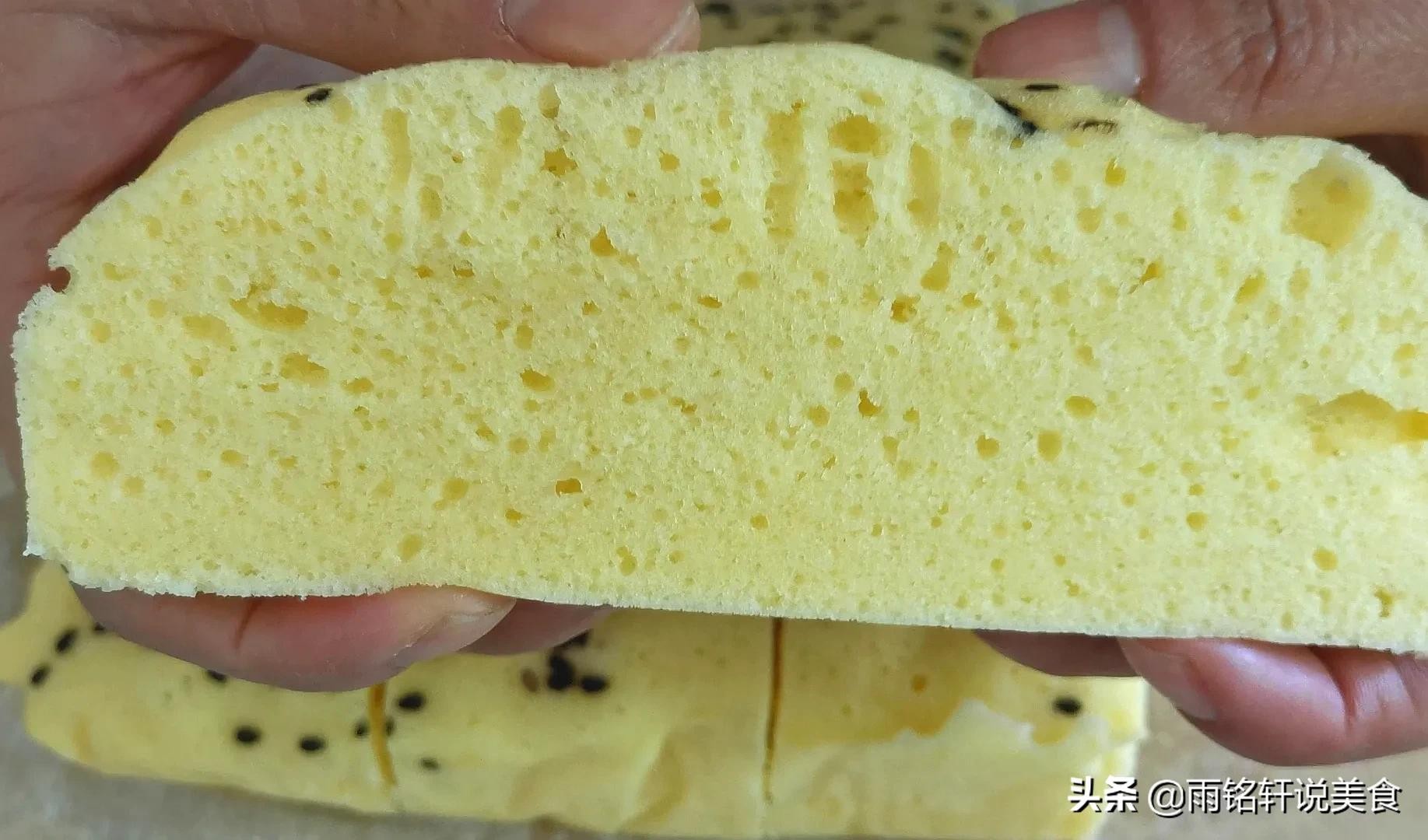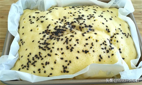 雨铭轩说:黄米糕蓬松柔软的关键一定要把鸡蛋打发至奶油状,加入面粉要上下翻拌均匀,别画圈圈的搅拌容易消泡,加入食用油使黄米糕更柔软。