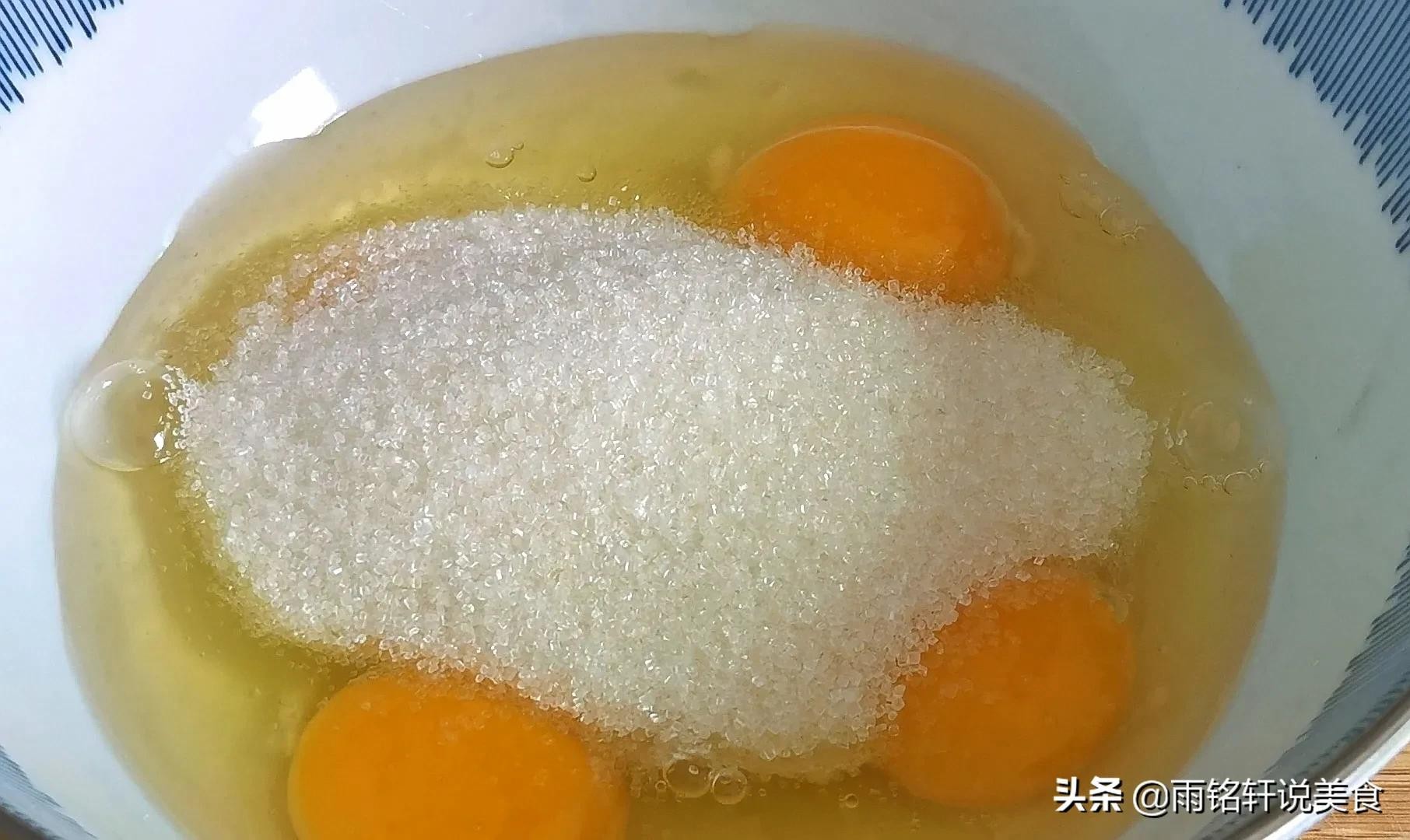 第一步:准备一个干净的大碗,碗中打入4个鸡蛋,倒入80克白糖,不喜欢吃甜的适量的减少,用打蛋器顺着一个方向把鸡蛋打发,最好用电动打蛋器省时又省力。