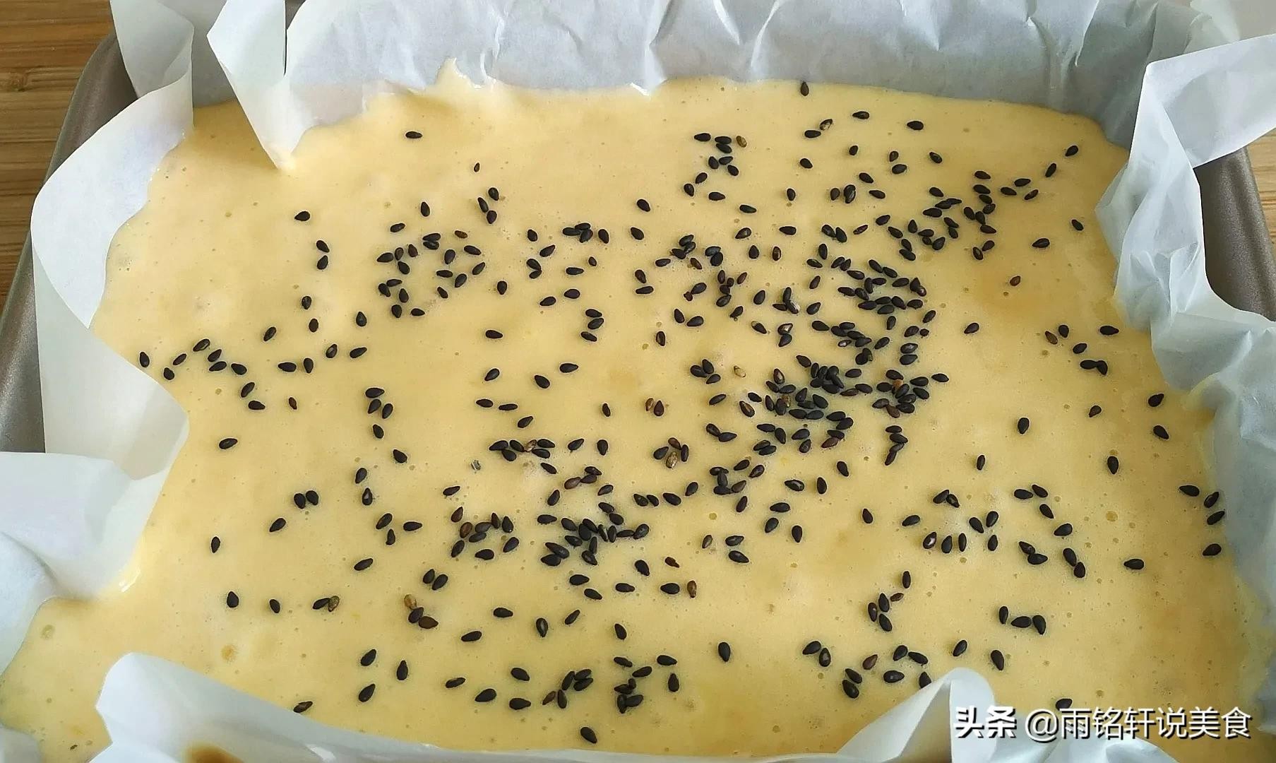 第六步:模具里铺上一张油纸更容易脱模,把面糊倒进模具里,上面再撒一些黑芝麻点缀一下。