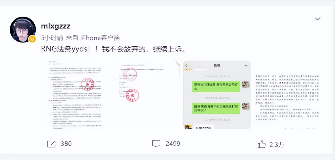 而在得知这消息后,mlxg表示:RNG法务yyds,他是不会放弃的,还会继续上诉,另外他发出的一些图片也有另外的一些细节,比如3000w就给了1000w,还有一半没有给等等,其实大家也知道RNG法务确实很强,以前RNG合同的纠纷事件,服装厂老板基地门口讨薪事件,卡选手合同事件等同样让大家记忆犹新。