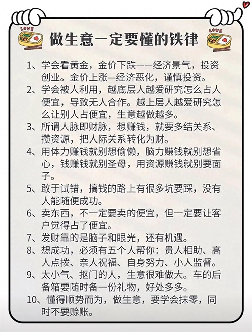 10. 顺应趋势与财务原则:做生意要顺应市场趋势;学会抹零能给客户好的体验,而不赊账可避免资金周转问题和坏账风险 。