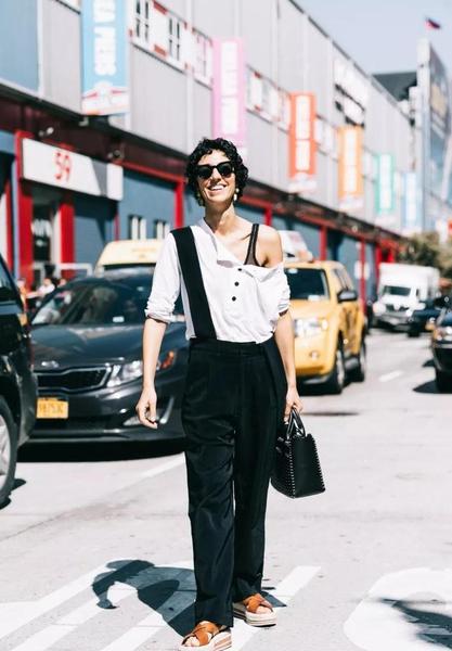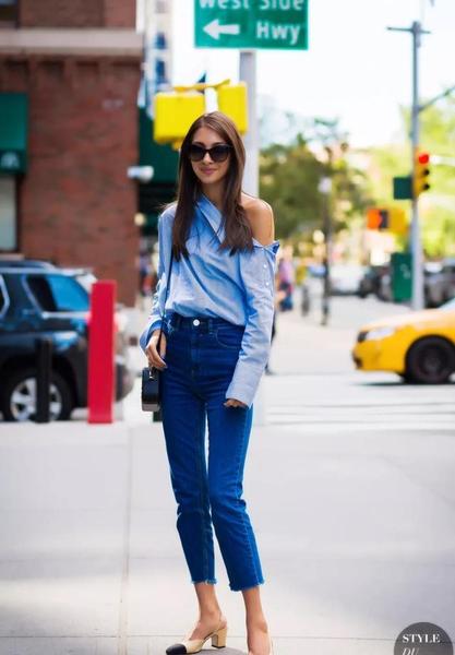 而且一件白衬衫也可以穿出设计感,将衬衫一边露出肩膀,穿上你美美哒的小背心,时髦感立显。