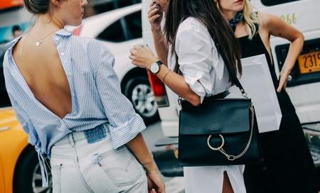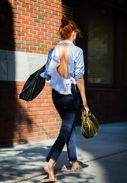 选择一款自带时尚元素的衬衫也是很好的选择,比如这个像是反穿衣的衬衫,露背设计性感十足。