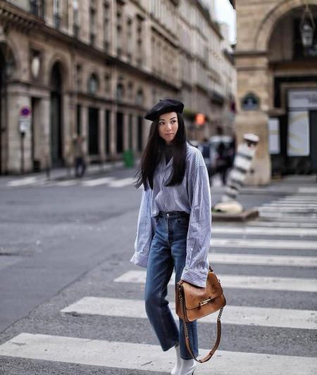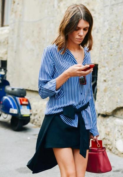 白衬衫之上就是蓝衬衫,温柔气质的蓝色,穿起来完全不挑人,尤其是蓝色条纹,更加具有时髦感,搭配裤子或是裙子都有不同的特色。
