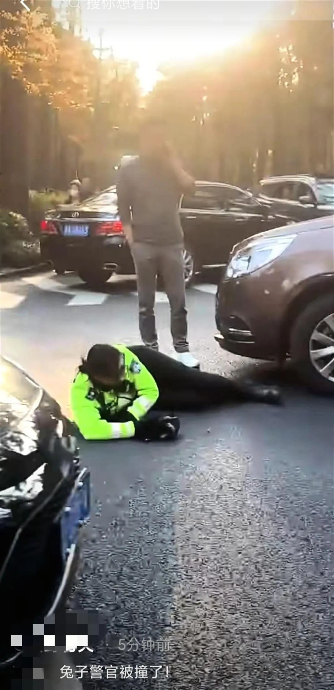 网友发出的一段视频显示,在通往灵溪南路的一个路口,一名女交通警倒地,疑似被车撞倒。画外音还说“‘兔子警官’被撞了。”另有网友发出的图片显示,这位女警被120医护接走。