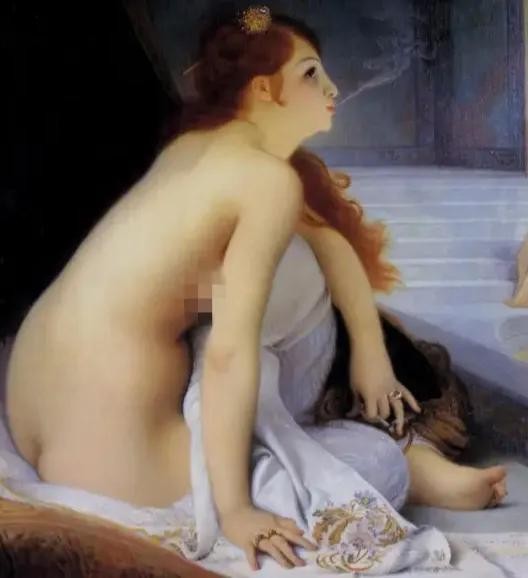 这幅画描绘了一位土耳其宫中浴池内的白人女奴沐浴好憩息的情景,此时她在池边休息,边抽烟边喝酒,显得非常放浪不羁。