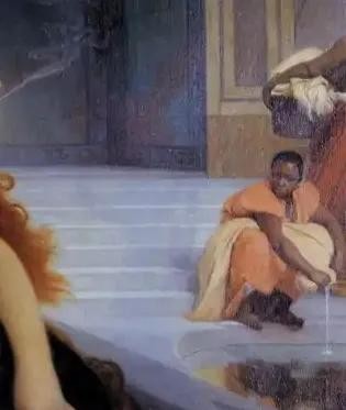 画家对女奴裸体的色彩描绘十分用心,画面中的色调娇艳有余、肤色呈粉润状态,解剖和结构虽不合理,但是对细节的刻画却一丝不苟,画家对环境的渲染也是十分成功的,体现了浓郁的东方色彩。