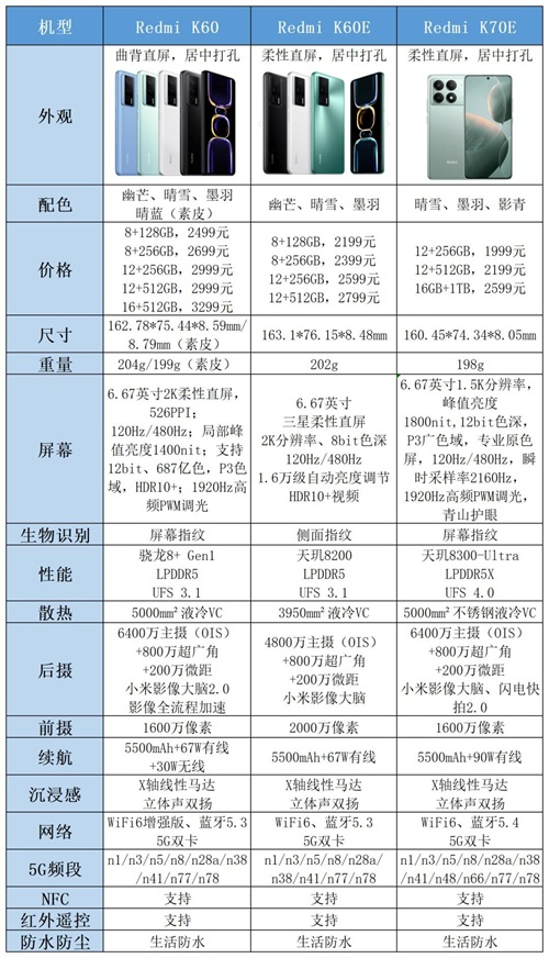 以上三款Redmi机型中,K60的优势在于处理器和无线充电,更像旗舰产品,价格也更贵;K60E的优势在于价格;K70E的优势在于屏幕上增加了“青山护眼”,同时1.5K的分辨率对续航更有利,快充提升到了90W,价格也不算高。如果不是对无线充电有刚需,三款手机更推荐Redmi K70E。