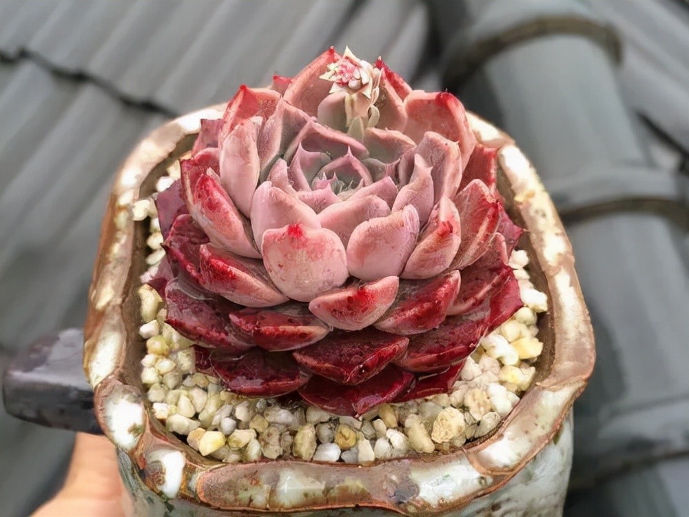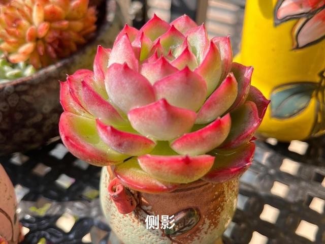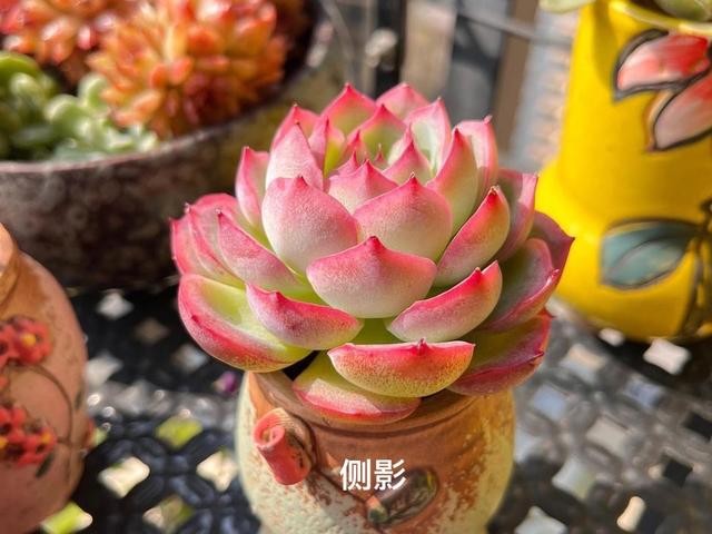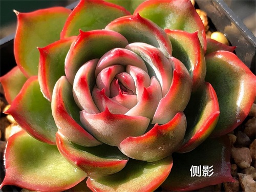 侧影也叫法兰西玫瑰,是月影系中一款红边非常明显的莲座型品种,出状态的时候整个叶片都会呈现粉红色的渐变色,叶尖以及叶缘的颜色会更加浓重一些,虽然不是花,但是看起来比花都要漂亮,也是我最喜欢的月影系多肉。这个季节正是其最美的季节,美到连手机都拍不出它们的美。