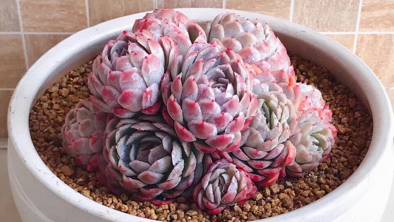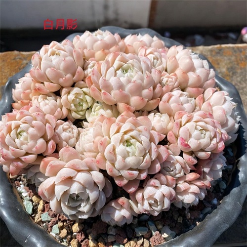 白月影的颜色虽然不是很浓艳,但是那种白中透粉的状态最勾人心,属于月影系中群生能力比较强的品种,在阳台上养护的时候,只要控制住浇水,别让其徒长,就一直都好看,极致状态下,外围的叶片还会出现粉红色,尤其是群生的白月影,看起来真的是很漂亮。