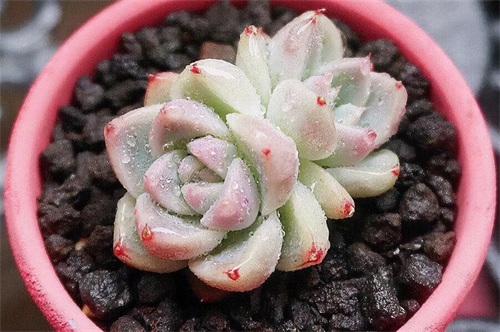 这个品种的耐晒能力不是很强,一般在温度高于35度的时候,就可以把它们往阳台内侧挪一挪,有明亮的散射光就可以,这个时候我们控制住浇水量的话,它们的颜色不会退得太严重,具体的做法就是沿着盆边给一圈水,让盆土有潮气就可以了。只要温度降低到30度一下,连续晒上几天太阳,就能变美,整个养护过程中,好像没有什么需要特别注意的地方,就是好养爱上色,很值得推荐。