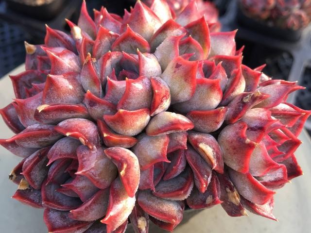 海琳娜属于中小型的品种,我们在养护的时候,初期盆土的颗粒含量不用太多,一般4成左右就可以,先保证其顺理服盆,然后再换上高颗粒的土就可以,花盆不用太大,比叶展大上一圈刚刚好,这个品种生长速度也很慢。海琳娜不容易徒长,想让其上色,除了要多晒太阳之外,还要使劲地控水,控到外围的叶片都发软再浇水就可以,如果有温差的话,那就更好了,上色会更容易一些。