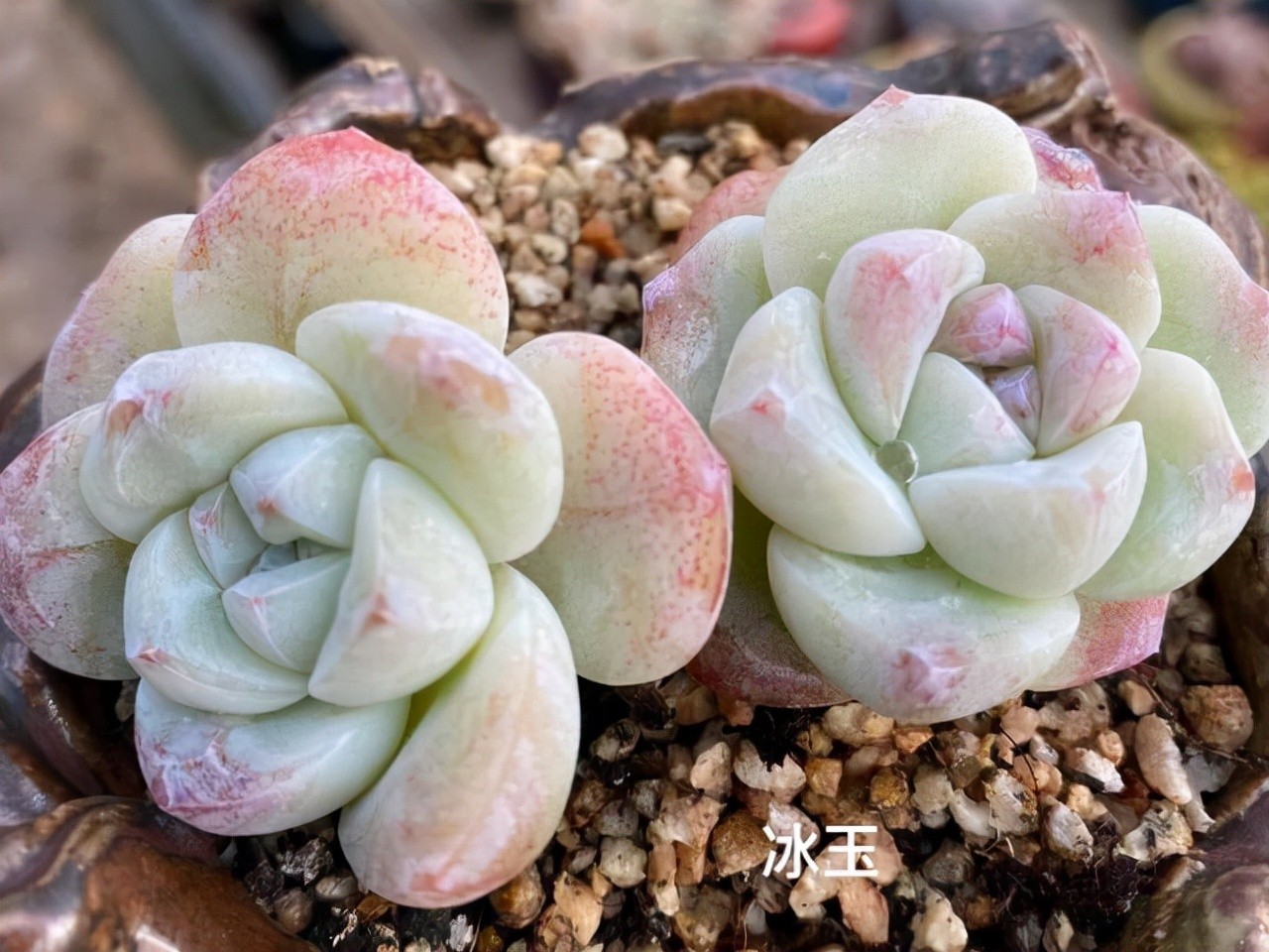 买冰玉最好挑一物一拍的店,因为这个品种还是比较讲究基因差异的,买的时候就挑品相好的,后期一般还能养出这样的状态。冰玉也适合控养,花盆要挤一点,土壤的颗粒含量高一点,光照多一点,控水狠一些,无论是露养还是室内养,冰玉的状态都不会很差。别看冰玉看起来很金贵,其实养护起来还真的很皮实,而且叶插繁殖也不难,很容易出现多头,是月影系中最值得推荐的品种之一。