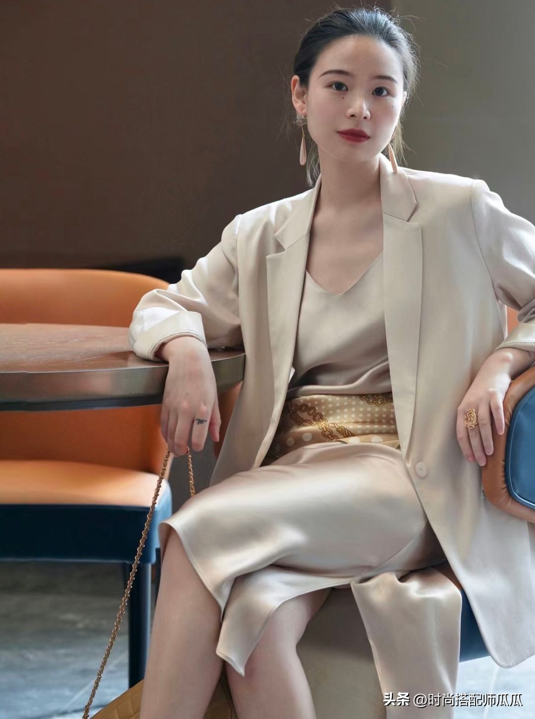 在选择材质的时候,也可以将肉眼就可见具有质感且彰显高级的丝绒或者是西装材质以及醋酸面料进行搭配,以上这3种面料它本身垂感都是属于比较重一些,而且西装的触感也比较明朗,所以对于我们身材状态的修饰效果以及气质的衬托力都是非常具有优势的。