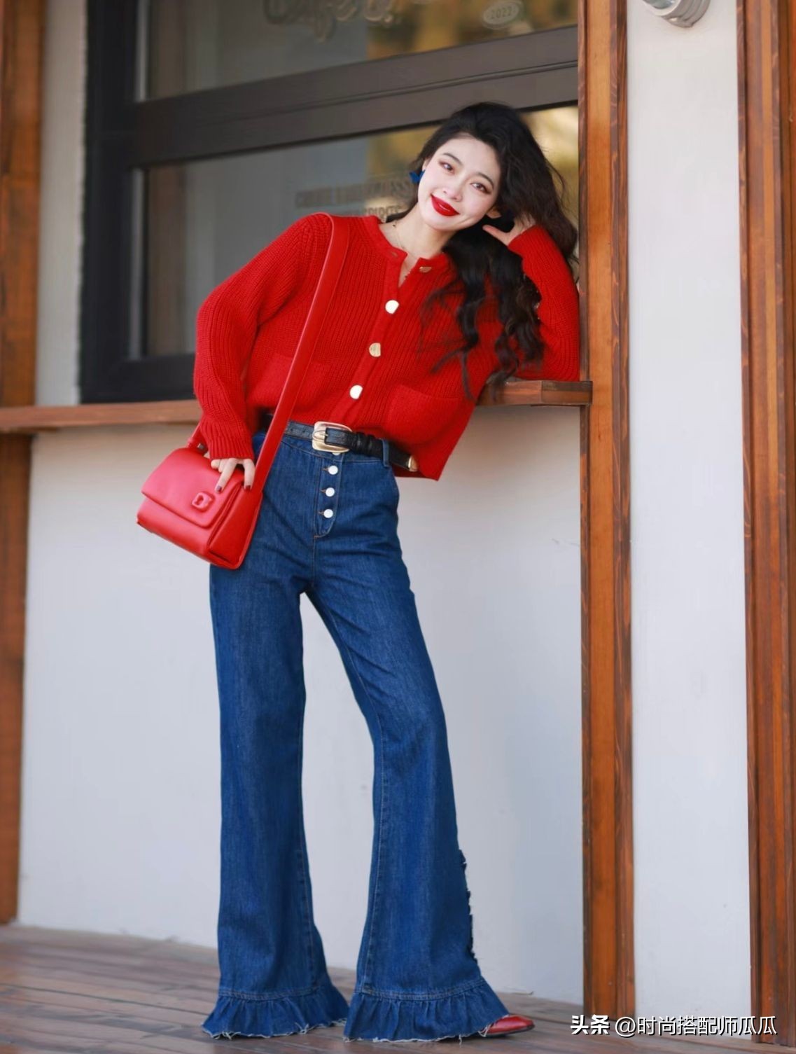 像比较深调一些的牛仔蓝或者是饱和度较低一些的蓝色调与深红色在一起结合的时候,它本身的视觉气质会偏向于绝对的复古感,而且蓝色也是属于很显白的系列。所以我们搭配的单品属于要裸露一些肌肤状态的时候,那么这样的组合又高级又显白哟。