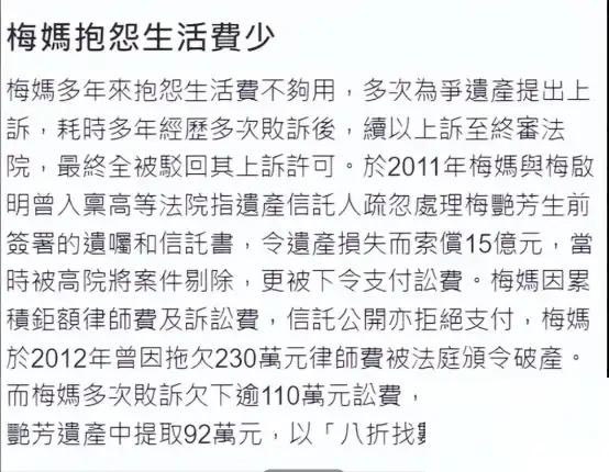梅艳芳的母亲虽然提起了诉讼,但她的诉讼请求却多次被法院驳回。法院认为,梅艳芳在生前已经立下了遗嘱,她的遗产分配方案是经过深思熟虑的,完全符合她的意愿,因此没有理由将遗产全部留给母亲。尽管如此,梅艳芳的母亲并没有就此罢手,她仍然不断地要求增加生活费,试图通过其他的方式来获得更多的遗产。