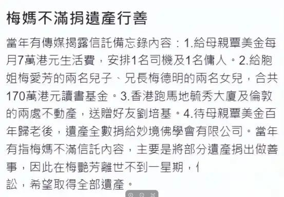 梅艳芳在生前就已经立下了遗嘱,她将自己的遗产合理分配,确保母亲每月能够获得7万港币的生活费,并且还计划将剩余的财产用于慈善事业。这样的遗嘱设计无疑体现了梅艳芳对母亲的关心和对社会的责任感,她希望自己能够在离世后继续为社会做出贡献,也希望自己的母亲能够过上好的生活。