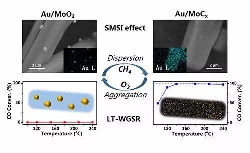 金属-载体强相互作用(Strong Metal-Support Interaction,SMSI)是多相催化中的一个重要概念,该效应常常会导致界面电荷转移、金属结构改变、分子吸附调变等现象,并最终强烈地影响到催化反应性能,关于SMSI效应的研究大都涉及金属/氧化物催化体系。过渡金属碳化物拥有类贵金属的电子性质,这赋予了它们非常独特的催化性能。在该工作中,研究人员从MoO3担载的Au纳米颗粒出发,通过碳化得到Au/MoCx催化剂。该催化剂中,Au呈现高分散态,Au与碳化物载体存在电荷转移,其低温水气变换反应活性优异,证实了Au与MoCx载体之间SMSI效应的存在。层状高分散的Au和聚集态的Au颗粒可以通过碳化和氧化处理相互转化,该工作首次报道了由循环的碳化-氧化处理引发的金属与碳化物载体之间动态SMSI效应。该研究中还利用原位表征技术XRD、XPS、XAFS等,探讨了Au在载体碳化处理过程中的分散机制,提出MoOxCy中间物种是分散Au的关键。