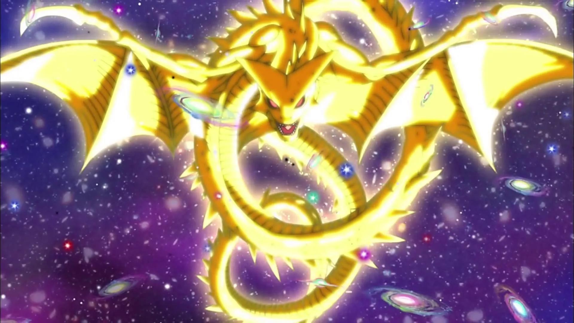 神之龙的体型有许多个银河系那么大,为一条有翅膀的金色蛇形龙,原型应该是玛雅神话中象征生命与丰收的羽蛇神。