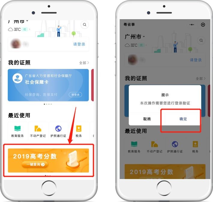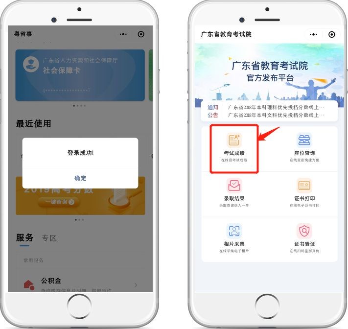 你也可以进入微信,搜索登录“粤省事”小程序,从首页下图箭头所指位置进入“高考成绩查询”。