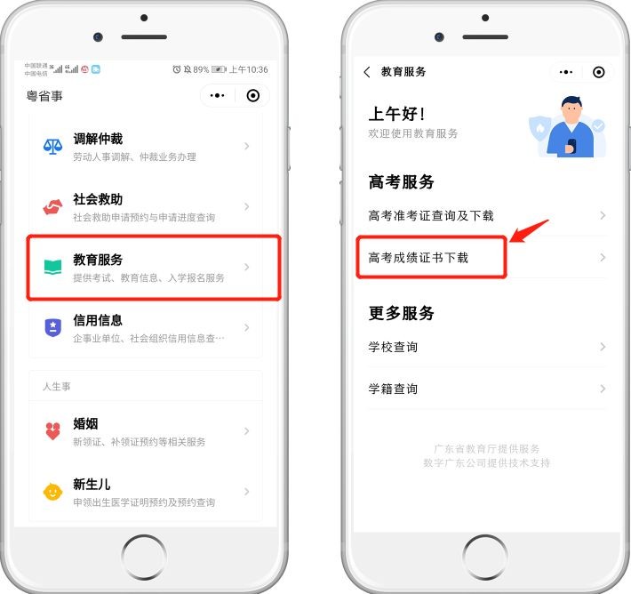 具体操作步骤:登录“粤省事”微信小程序,下滑选择“教育服务”板块,点击“高考成绩证书下载”,并根据操作步骤指引获取下载链接,可后续下载保存打印。