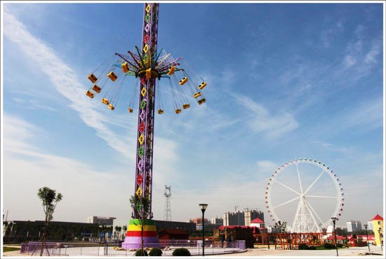 远远的就会看到百米地标性摩天轮立在那里,走进之后才看到摩天轮是五颜六色的,在阳光下散发着别样的色彩。如果你是在晚上来的话,还可以欣赏到亮灯的摩天轮,如同一道虹光,梦幻的色彩,璀璨夺目,宛若童话之中的玩物,满足了喜欢浪漫之人(譬如小编)的小心思,据介绍它的运行高度可达100米,载客量近达三百人,一圈游览的时间为18分钟,是三晋大地最高最大的摩天轮。随着它的缓缓上升我们可以欣赏到园区不同地方的景致,到达最高点时,可将园区及大半个晋中的景色一览无余,小编都忍不住发出这里风景最美的赞叹之声。这里也是情侣约会的胜地啊,据说在摩天轮抵达最高处时接吻的情侣会幸福久久哟