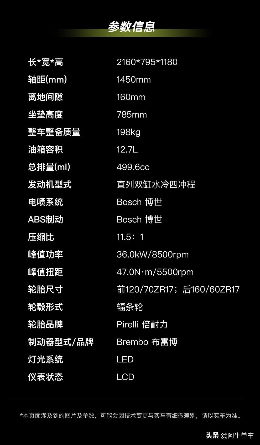 动力方面依然是499cc水冷8气门并列双缸水冷发动机,最大功率36kW@8500rpm,最大扭矩47N·m@5500rpm。不过Sport版最大的升级是在制动方面升级到了Brembo刹车卡钳,以及一些外观件的升级。售价为46800元,这个售价相对于普版38800元、Trail版43800元来说,高出了不少。