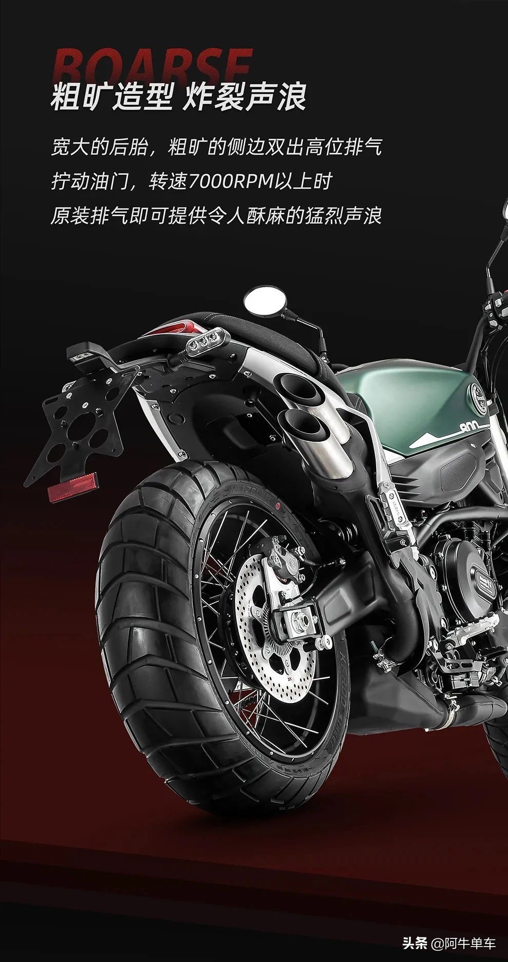 分离式手把;复古头罩;铝合金轮毂;运动化的配色风格;骑行姿态的调整;座垫后部溜背设计以及单边双出的消声器等,无不体现出更加运动化的产品设计风格。