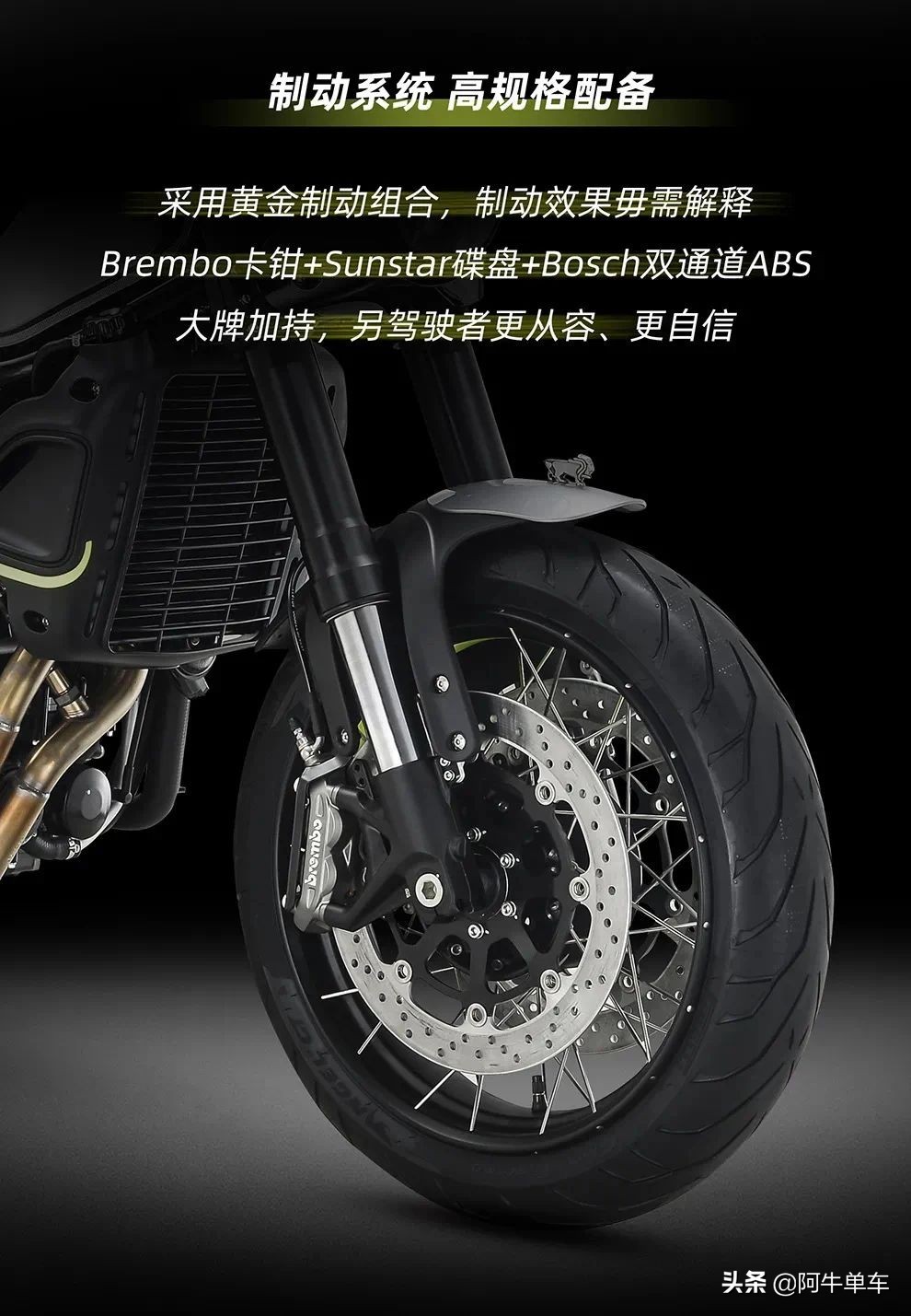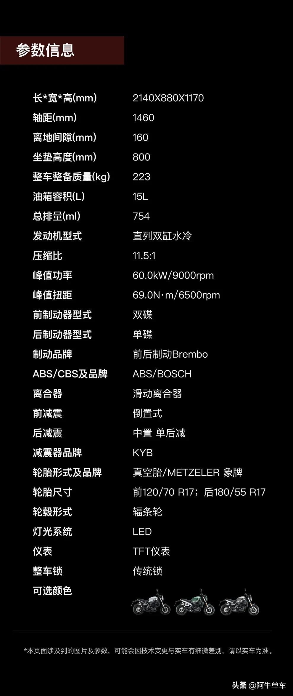 车辆主体钢管编织车架搭配754cc水冷8气门并列双缸发动机,最大功率60kW/9000rpm,最大扭矩69N·m/6500rpm。减震为前后KYB可调减震,搭配前后Brembo的刹车卡钳,博世双通道ABS。