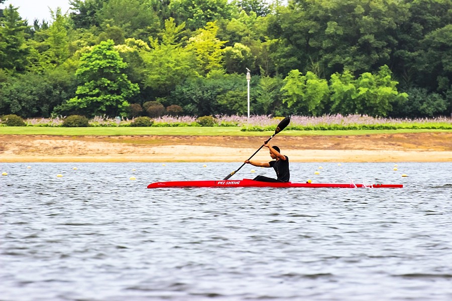 男子单人皮划艇,运动员正在进行专业的训练。
