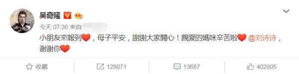 29日一早,吴奇隆宣布刘诗诗产子喜讯,发文称:“小朋友来报道,母子平安,谢谢大家关心!亲爱的妈咪辛苦了。”并且文字最后艾特刘诗诗表示谢意;随后刘诗诗转发发文直言小朋友超级可爱。