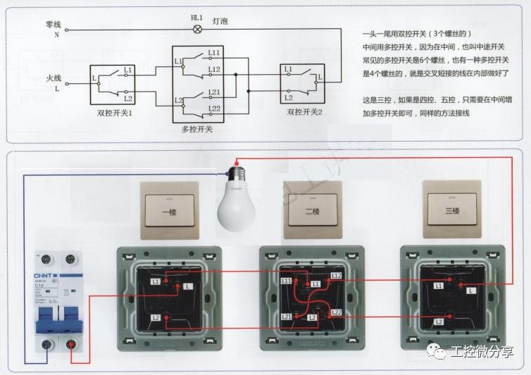 2、应用场景:也许你家里房间多,客厅要装一盏灯照明,并且,在每个个房间都要,控制这盏灯。那就需要多控开关电路实现。以下举例为三层楼房的情况,开关使用一头一尾双控开关(3个螺丝的),中间用多控开关,因为在中间,也叫中途开关。常见的多控开关是6个螺丝的,也有一种多控开关是4个螺丝的,就是交叉短接的线在内部是做好的。这是三孔,如果是四控、五控,只需在中间增加多控开关即可,同样的方法接线。