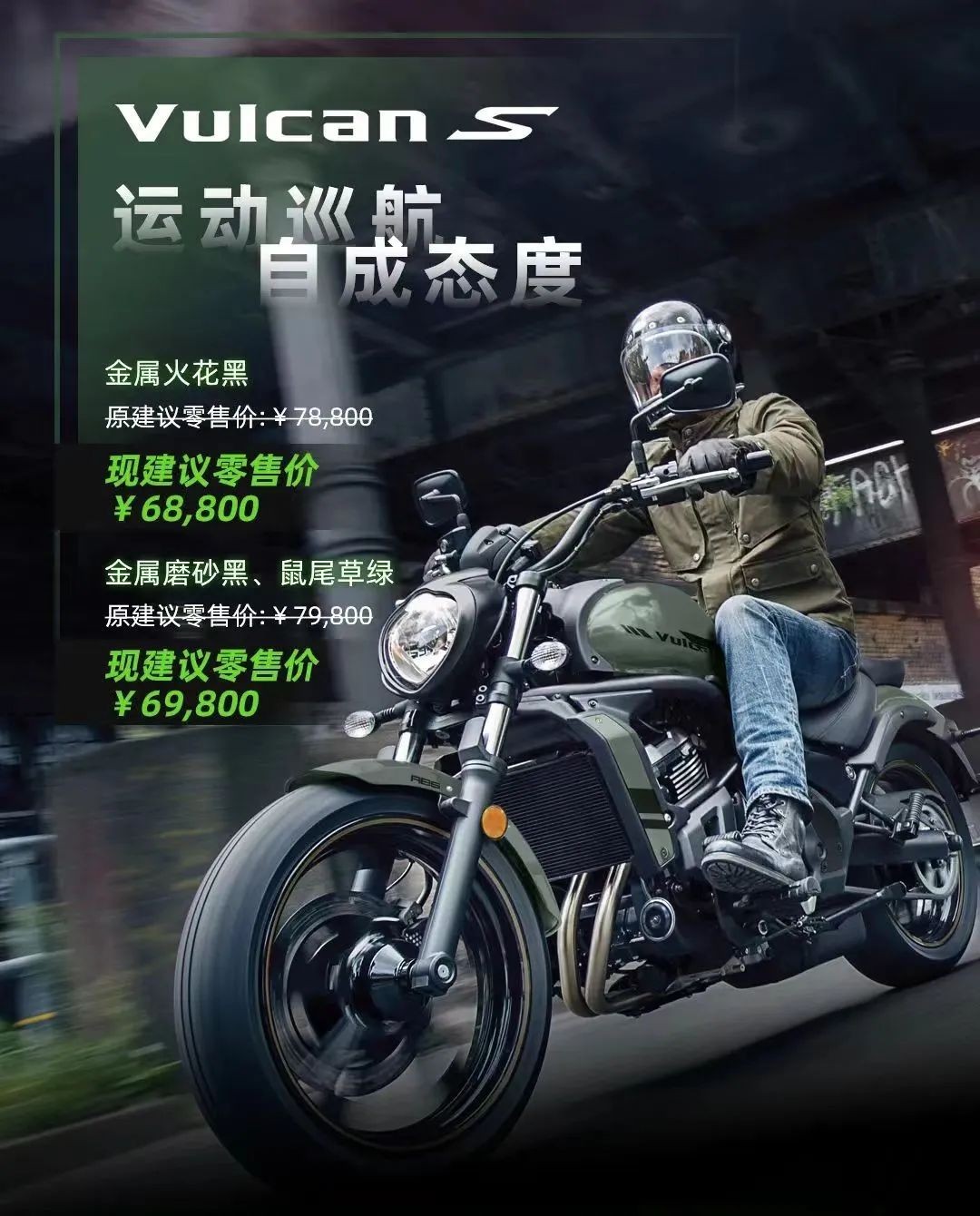 Ninja650普版与KRT版降幅一致为5500元,降后售价分别为69300元与69800元,两个版本最终售价仅差500元,想来普版是用来摆烂的吧。而小火神Vulcan两个版本降幅同样都为10000元,降价后售价分别是68800元与69800元。