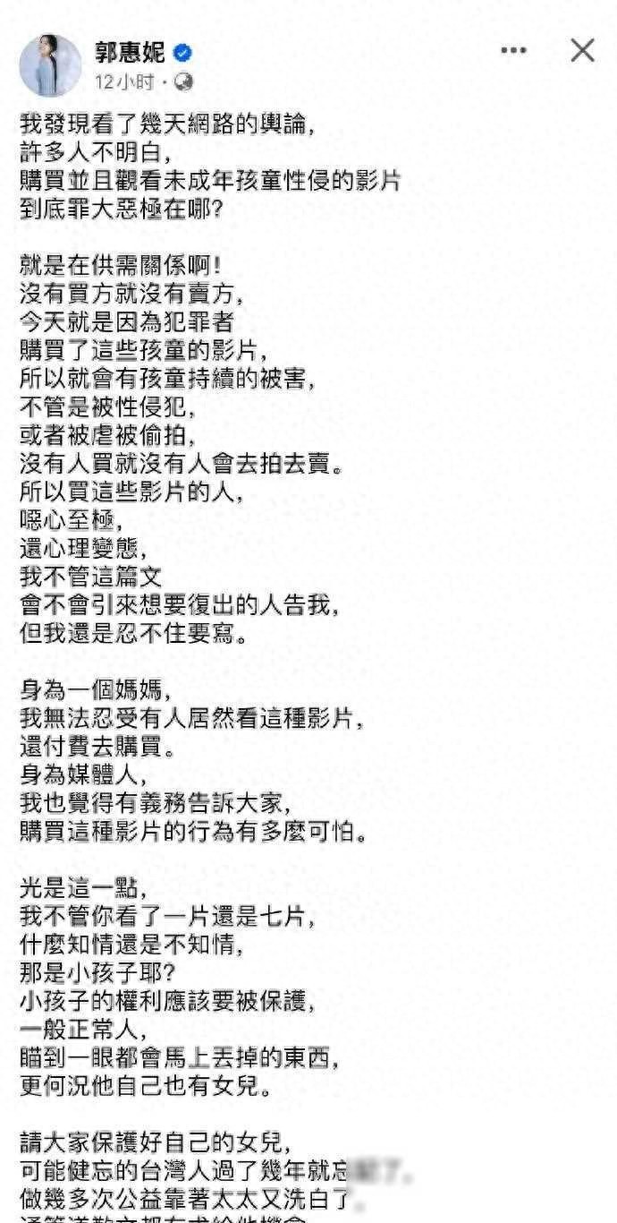 郭惠妮发文谴责黄子佼:没有人看就没有孩童性犯罪