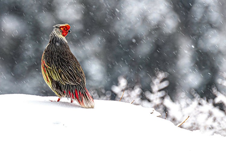 2019年3月31日, 西藏山南卡久寺, 藏雪雉迎雪矗立。宋林继 摄